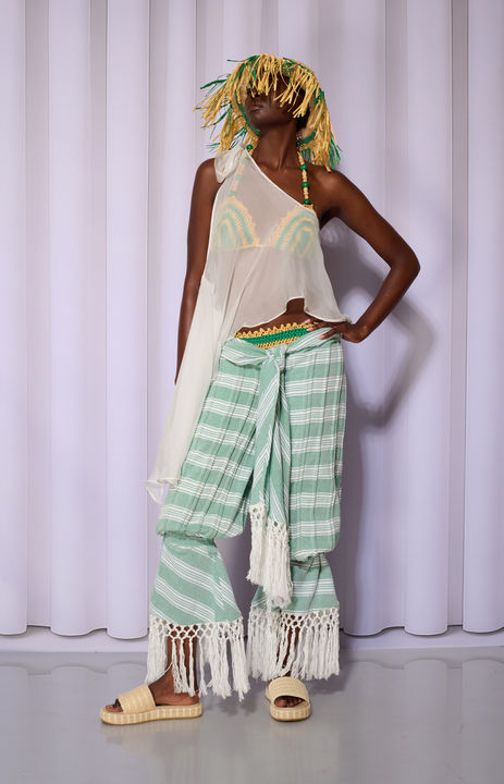 The collection offers a new outlook on the local resort – Metzitzim beach in Tel Aviv becomes a new fantasy arena, one that manages to combine the Mediterranean luxury of Mykonos with the effortless charm of Tel Aviv. Between standard municipal beach facilities and the luxury of a cocktail on a yacht, a colorful, humorous and multi-layered dialogue about culture, place and adaptation to unexpected situations is woven. Through a combination of diverse techniques such as digital printing , cording, weaving, and crochet, while using a strong and saturated design language, a visual world was built that translates the contrast between the dream of a photogenic and exclusive vacation and the Israeli reality into one bold and self-aware resort collection.
