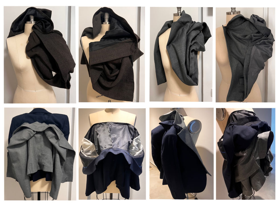 I chose the jacket as the central garment in each of the five outfits, with each look representing a different stage in the bleaching process. The collection was developed using techniques such as freehand draping, fabric sculpting, and handcrafted leatherwork, involving distortion, deconstruction, and reconstruction of the familiar jacket form.