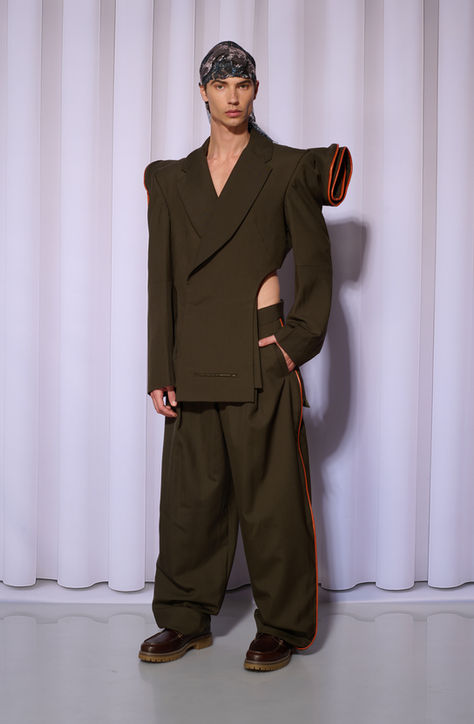 I chose to express this complexity through menswear, incorporating feminine elements inspired by elderly Ethiopian women—women who carried heavy physical and emotional burdens without showing pain.