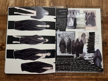 Through layering techniques, textile sculpting, wrapping, and concealment, I created a women’s collection of five looks, each examining the tension between hidden identity and external appearance, raising questions about the role of women within religious, political, and social constraints. A monochromatic palette of black and white emphasizes the duality of concealment and revelation, oppression and liberation. Black represents bodily covering, shadow, and erased identity; white symbolizes the moment when light begins to break through.