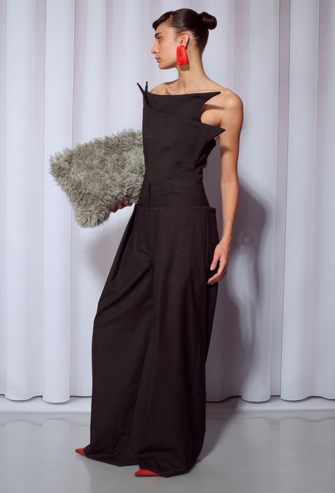 לצידם, גם פסליו העצומים של ריצ'רד סרה מהווים השראה לקולקציה - גופי פלדה חלודים ומחוספסים, היוצרים חוויה פיזית של כובד, ניכור ועוצמה תעשייתית, המטילה את נוכחותה על הסביבה. הקולקציה כוללת חמש מערכות לבוש לנשים, בשילוב טקסטורות מורכבות של צמר, ויסקוזה, עור ומתכת. הגזרות נעות בין מבניות קשוחה, כסמל לשליטה תעשייתית, לבין רכות ותנועה שמבטאת שבריריות וחשיפה. העיצוב שואף לגבש אסתטיקה גבוהה מתוך פירוק חומרי ורעיוני ולעורר דיאלוג בין יוקרה עיצובית לאחריות סביבתית.