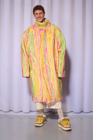 I designed a ready-to-wear menswear collection featuring oversized, exaggerated silhouettes that highlight the contrast between the smallness of the body and the largeness of the garment, blurring the lines between childhood and adulthood. I created a series of hand-drawn prints based on my own illustrations, and brought them to life through a mix of techniques like knitting, digital printing, and hand-painting directly onto the garments — each one reflecting the emotions and tension that come with growing up.